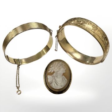 Two 9ct rolled gold bangles together with an antique cameo brooch (3)