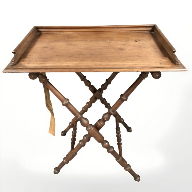 A walnut X-framed table, with tray top, 79 cm.