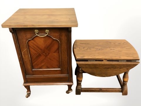 A reproduction oak drop leaf occasional table and a late Victorian coal receiver