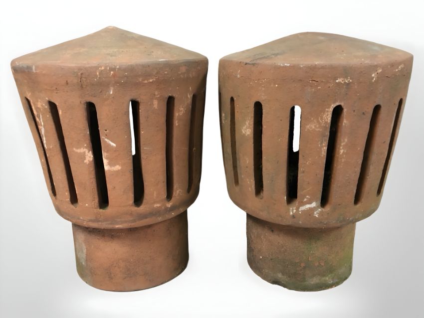 A pair of Stangas terracotta chimney caps, height 37 cm