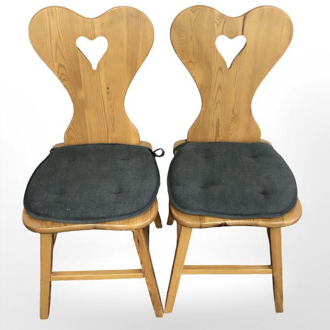 A pair of 20th century pine occasional chairs with heart shaped back rests