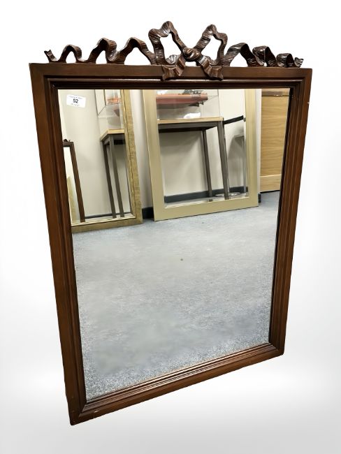 A contemporary mahogany mirror with ribbon pediment, 70 cm x 99 cm.