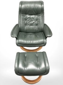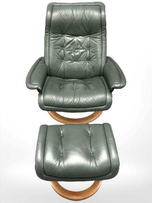 A Norwegian Ekornes Stressless green leather swivel armchair and matching footstool