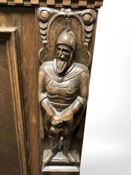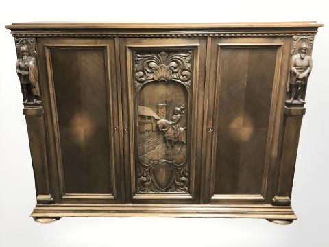 A 20th century continental heavily carved oak triple door sideboard, 176 cm x 50 cm x 132 cm.