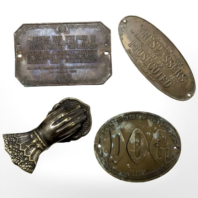 Three 19th century brass warning plaques, Beware of the Dog, Trespassers will be Prosecuted, and Gentlemen are Kindly Requested to Discharge their Weapons Before Entering this Establishment, together with a brass paper clip in the form of a hand.