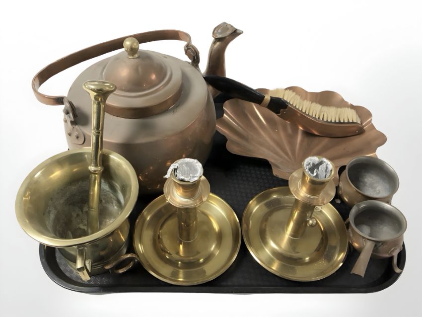 A copper kettle, pair of brass chamber sticks, pestle and mortar, and other metal wares.