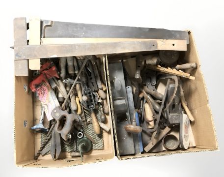 Assorted vintage carpentry tools including planes, hand drill, saw, chisels, etc. (2 boxes)