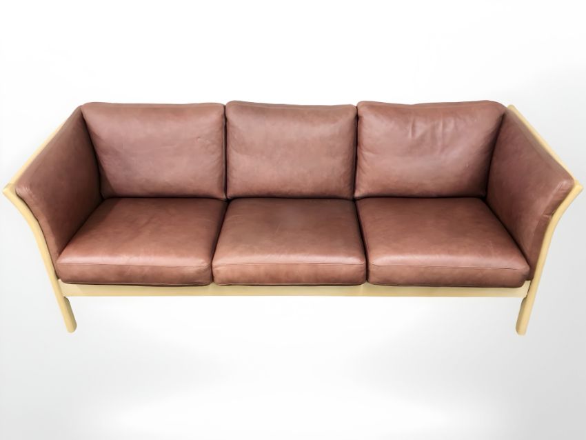 A Danish Skalma wood framed terracotta leather three seater settee, 203 cm x 84 cm x 80 cm.