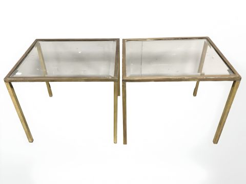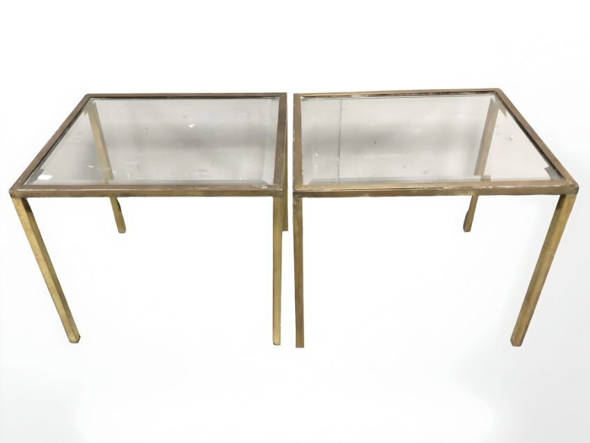 A pair of brass and bevelled glass lamp tables, width 50 cm.