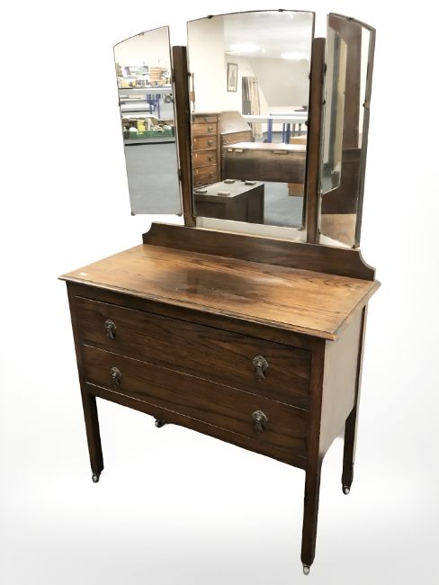 An Edwardian oak two drawer mirror back dressing chest, 92 cm x 44 cm x 154 cm.