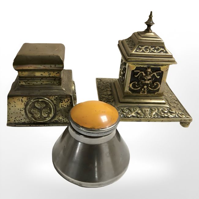 Two brass Art Nouveau inkwells and a later stainless steel conical example.