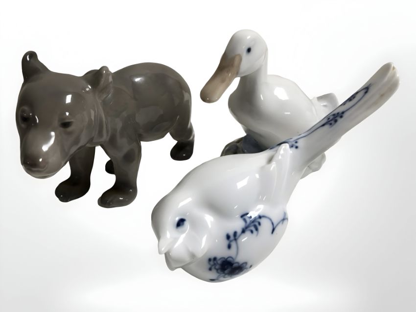 A Royal Copenhagen bear cub, a duck and a further figure of a bird, longest 15 cm.