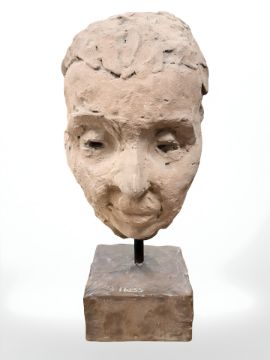 Thisa Hess : Terracotta mask study on square plinth base, signed, height 29 cm.