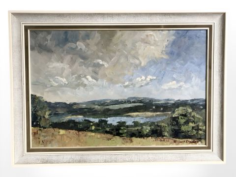 20th century school : an expansive rural landscape, oil on board, 49 cm x 75 cm indistinctly signed