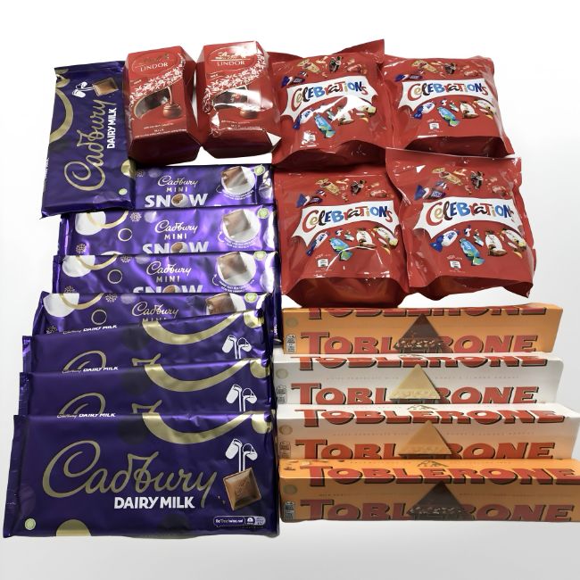 Eighteen various packets of chocolate confectionary including Cadbury's, Lindor, Toblerone, etc. (1 box)