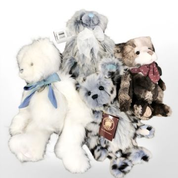 Four Charlie Bears with tags including Mushroom, Bud, Damon and Charlie Year Bear 2020, a limited edition of 4000