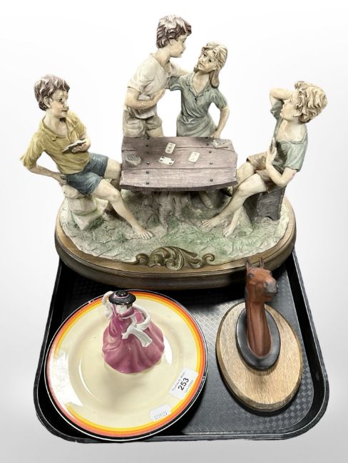 An Italian figure group of children playing cards, a further Leonardo Collection figurine, a Clarice Cliff for Newport Pottery Bizarre plate and a Beswick horse head on wooden oval mount.