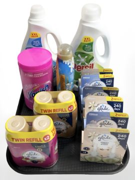 Six Glade scent diffusers and six various bottles / packs of laundry detergent and scented sprays.