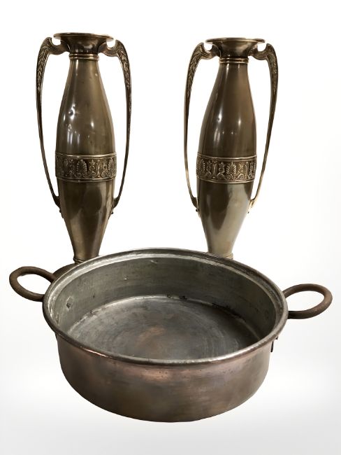 A pair of Art Nouveau brass twin-handled vases, height 44 cm together with a twin-handled pot