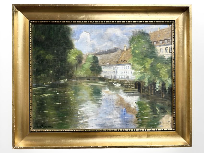 Danish School : Buildings by a canal, oil on canvas, 41 cm x 31 cm, indistinctly signed.