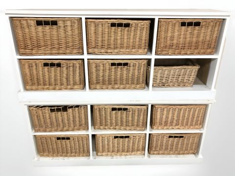 Two painted low sideboards, with six wicker drawers, each 151 cm x 39 cm x 65 cm.