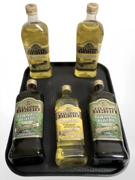 Five bottles of Filippo Berio olive oil.