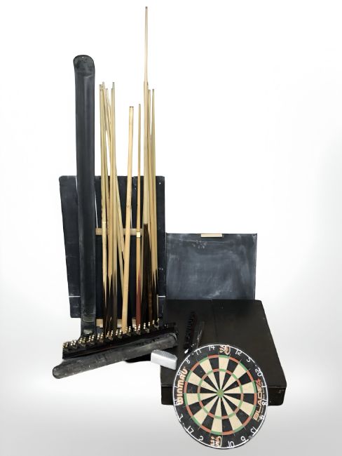A collection of billiards cues, chalk scoreboard, a dartboard, etc. (1 box)