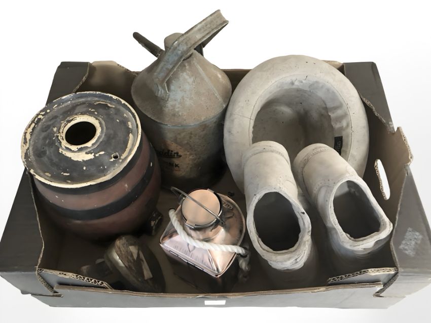 A reproduction ship's mast head lamp, Aladdin paraffin can, stoneware barrel, a pair of Seletti Design clay shoes and similar top hat, and an iron. (1 box)