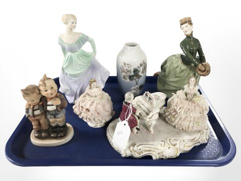 A Royal Doulton figure 'Grace' HN2318, a Coalport ladies of fashion figure 'Stella', Hummel and Dresden figures, and a Royal Copenhagen vase.