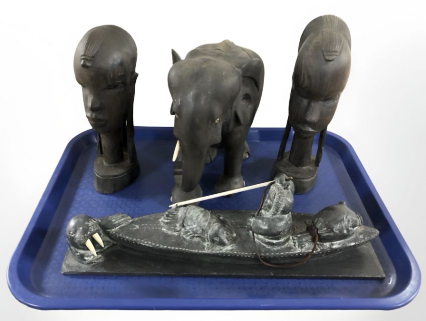 A pair of African carved hardwood busts, similar figure of an elephant and a Canadian Inuit carving.
