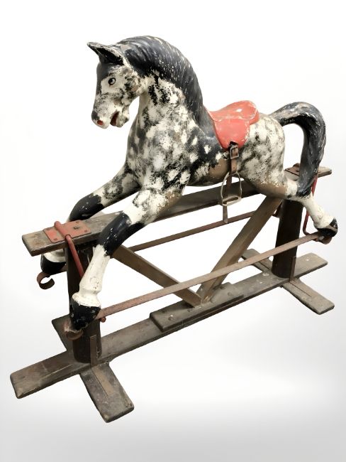 A 20th century painted composition rocking horse on stained pine stand, overall 145 cm long