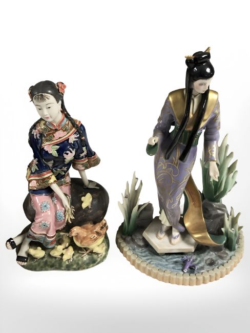 A Franklin Mint porcelain figure entitled 'Ayame', height 30 cm, and a further Chinese pottery figure of a woman feeding chickens.