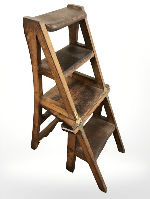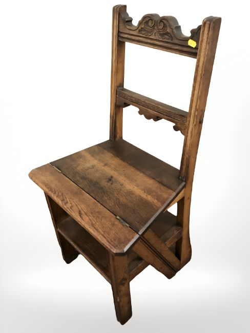 An Edwardian oak metamorphic library chair.