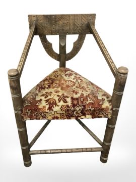 A carved oak turners armchair, together with three elm farmhouse spindle back chairs. (4)