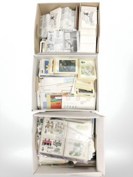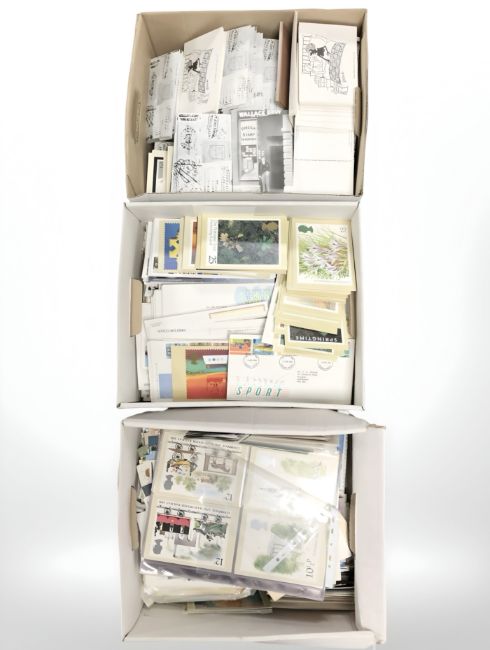 Many hundreds of modern postcards, Royal Mail first day covers, etc. (3 boxes)