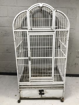 A large painted metal bird cage, 91 cm x 72 cm x 182 cm