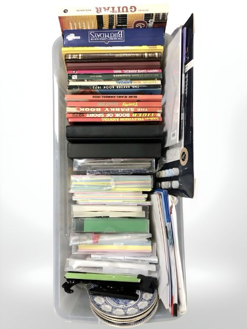 A small quantity of books and annuals, craft paper, Masons blue and white collectors plates. (1 box)