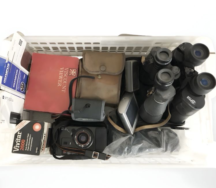 A pair of Denhill 10x50 binoculars, Optus 24x50 binoculars, Canon AF35M camera, Vivitar flash, other cameras, satnavs, etc. (1 box)
