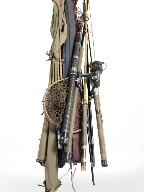 A group of split cane fishing rods, landing net, etc. (1 box)