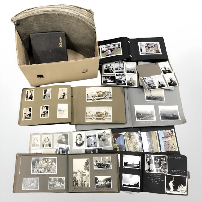 A quantity of antique and later monochrome photographs, world images, together with a box containing albums of monochrome photographs, etc.
