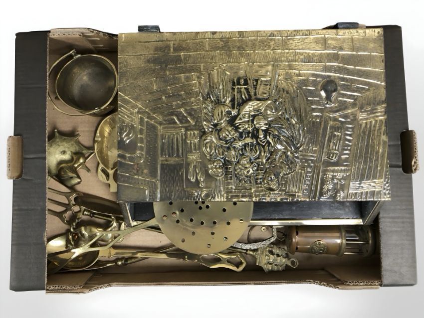 A group of brass ornaments, a brass magazine rack, a miner's lamp, etc.