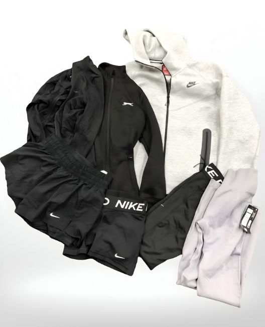 A group of new retail stock clothing including workout wear, Nike items, shorts, a Nike hoodie, etc.