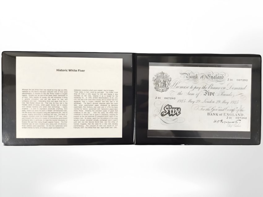 A Westminster issue - Historic white fiver, Bank of England May 29th 1945, numbered J31 067282.
