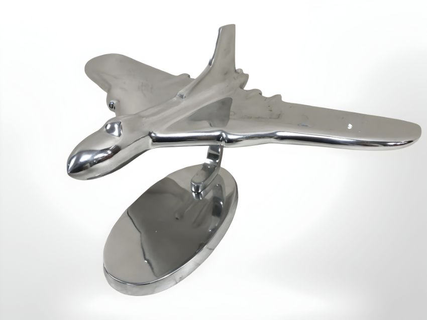 An aluminium model Vulcan bomber on stand.