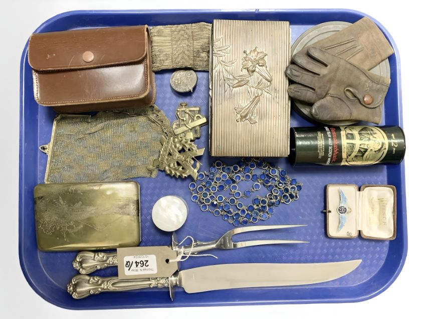 An interesting collection of collectables : A pair of vintage brown leather child's gloves, together with an RAF brooch, two chain purses, coins, necklaces, ring, jewellery, cap badges, film reel, Bunnahabhain miniature whisky, mother-of-pearl pill box, cigarette box, cigarette case, two-piece carving set, cased gent's travel brush, etc. (Q)