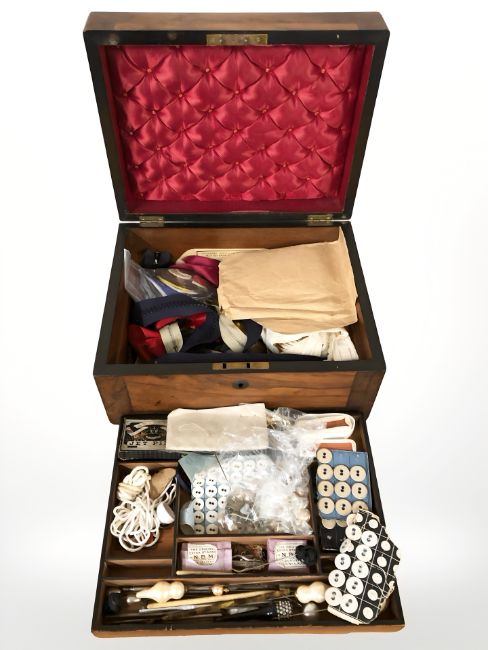 A Victorian mahogany sewing box and contents, width 30.5 cm.