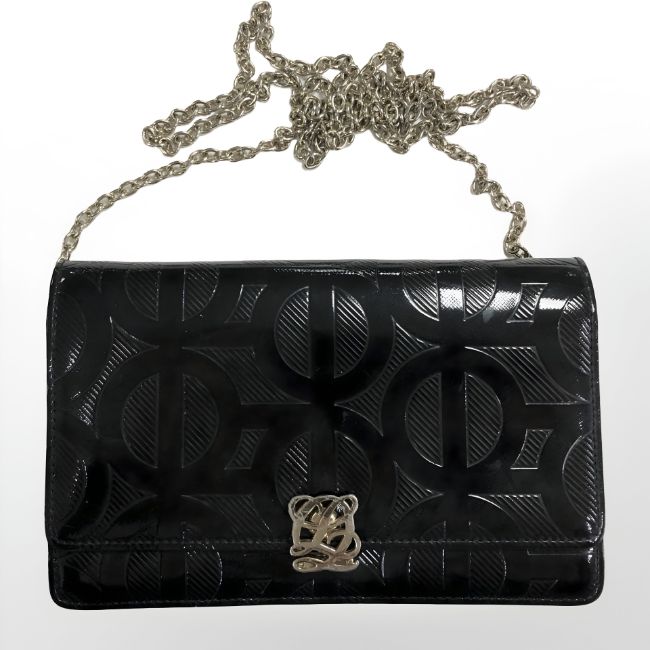 A Louis Quatorze lady's black laminate handbag with chain.