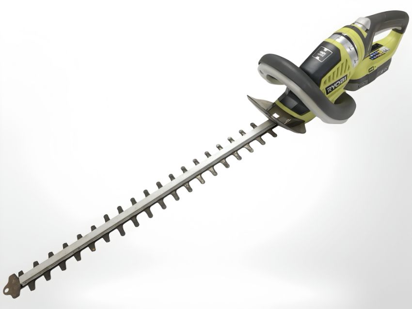 A Ryobi electric hedge trimmer with battery.
