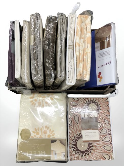 Eleven packs of new bedding including double duvet cover with pillow cases, multipack of duvet cover, pillow cases and curtains with tiebacks, etc.