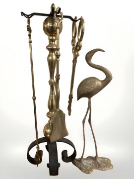 A brass and wrought iron companion set and a brass figure of a flamingo.